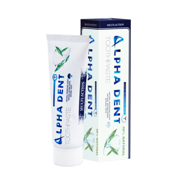 خمیردندان مولتی اکشن آلفادنت حاوی آلفاپاینن و سدیم فلوراید است. خمیردندان مولتی اکشن آلفادنت یک محصول منحصربه فرد، با قابلیت مصرف روزانه، با میزان فلوراید بهینه و استاندارد می باشد که موجب بهبود و حفظ سلامت، زیبایی و بهداشت دهان و دندان می گردد. ویژگی بارز تمامی مدل های خمیردندان آلفادنت ایجاد تازگی نفس و خوشبوکنندگی دهان با ماندگاری بالا است.