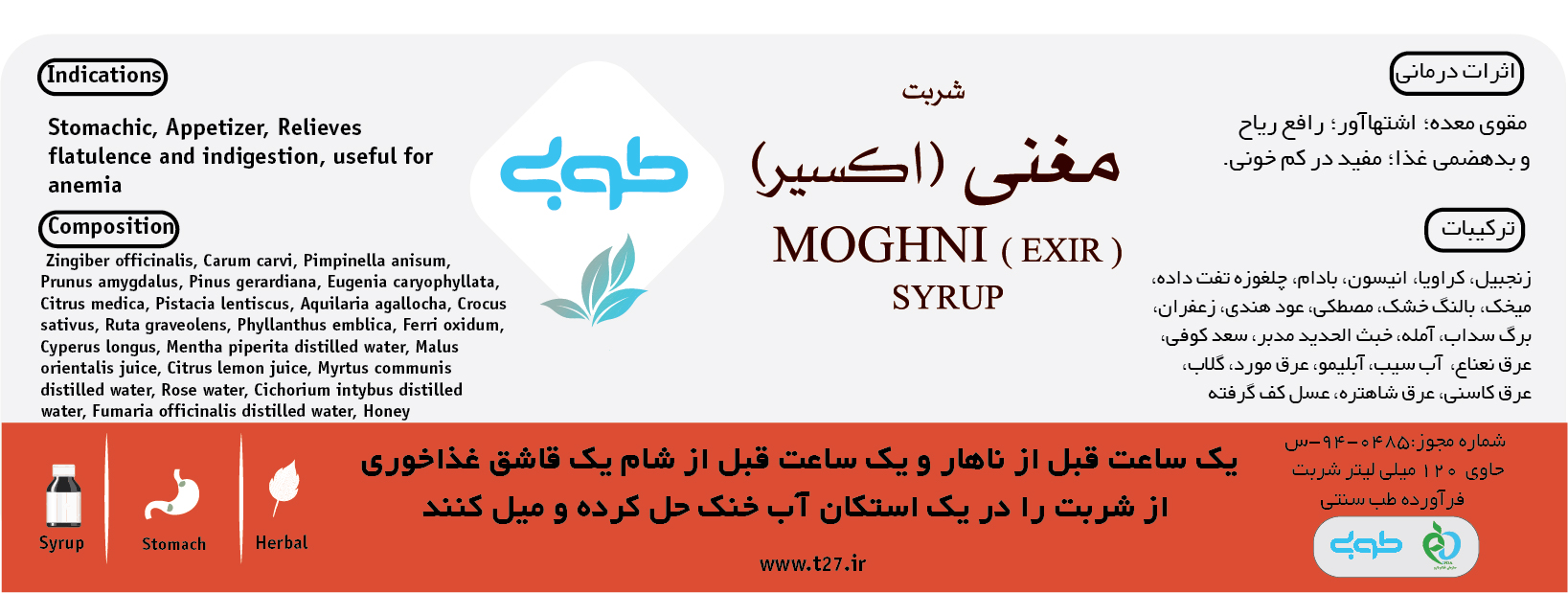 نيمساعت پيش از صبحانه و شب موقع خواب دو قاشق غذاخوري از شربت در يک استکان آب گرم حل کرده، ميل کنيد