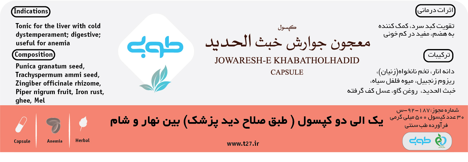 اجزاء فراورده: دانه انار، تخم نانخواه (زنيان)، زنجبيل، فلفل سياه، خبث‌الحديد، روغن گاو، عسل