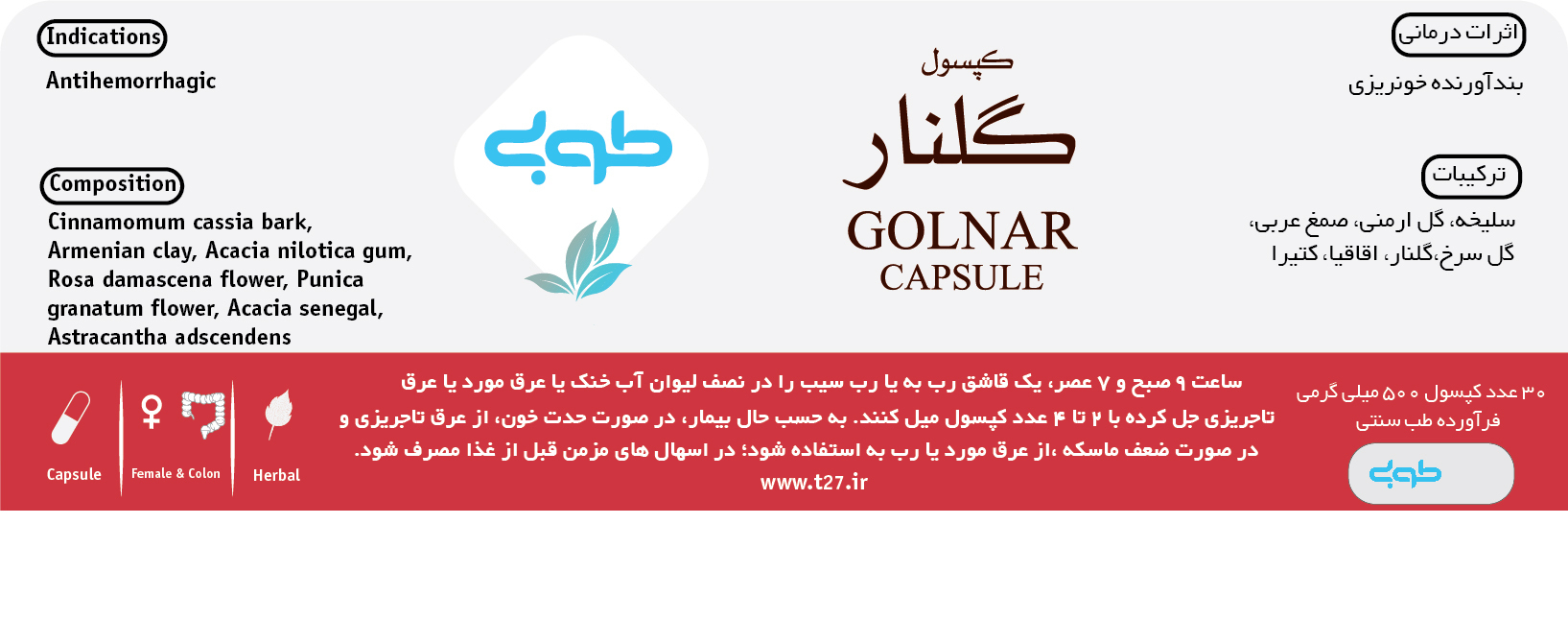 اجزاء فراورده: سليخه، گل ارمني، صمغ عربي، گل سرخ، گلنار، اقاقيا (بدل: عدس)، کتيرا