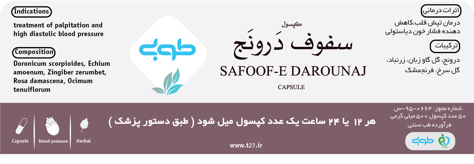 اجزاء فراورده: درونج، گل گاوزبان، زرنباد، گلسرخ، فرنجمشک