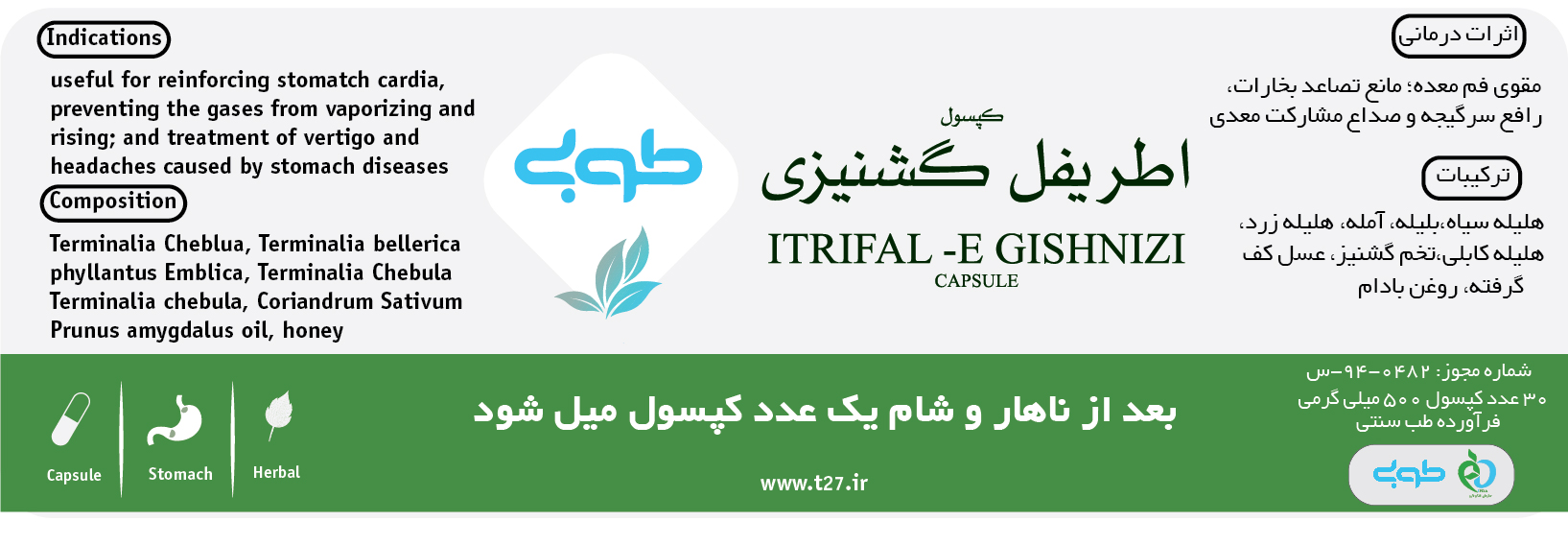 اجزاء فراورده: هليله سياه، بليله، آمله، هليله زرد، تخم گشنيز، عسل کف گرفته