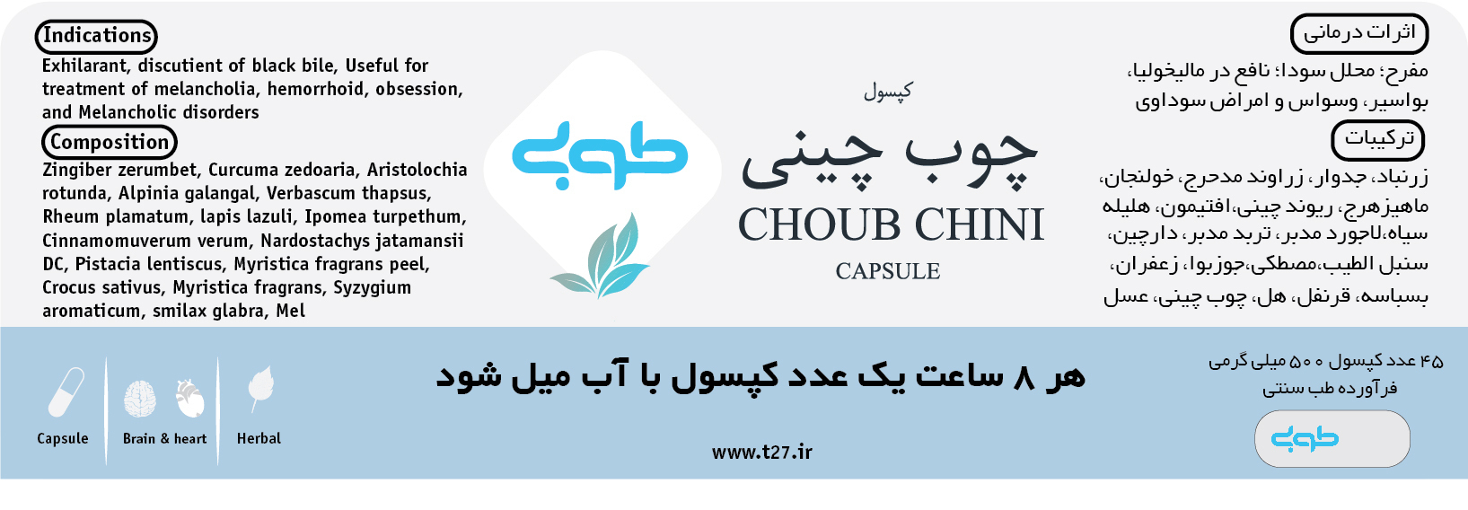 اجزاء فراورده: زرنباد، جدوار، زراوند مدحرج، خولنجان، ماهيزهرج، ريوند چيني، افتيمون، هليله سياه، لاجورد مدبّرمغسول، تربد مدبّر، دارچين، سنبلالطيب، مصطكي، جوزبوا، زعفران، بسباسه، قرنفل، چوب چيني، عسل كفگرفته