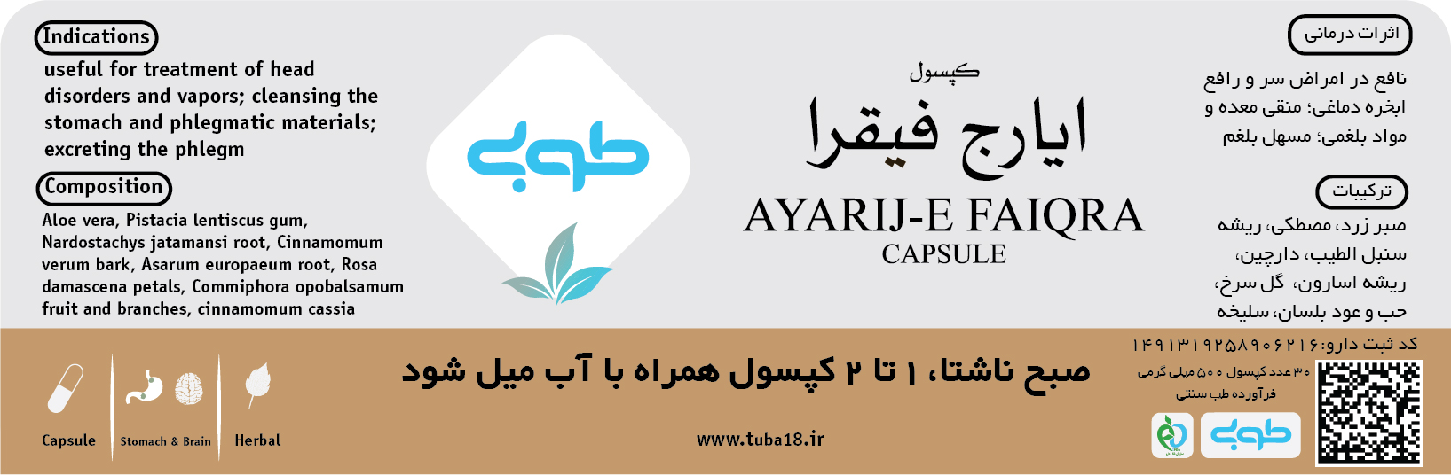 اجزاء فراورده: صبر، مصطکي، سنبلالطيب، دارچين، اسارون، گل سرخ، حب بلسان، عود بلسان، سليخه